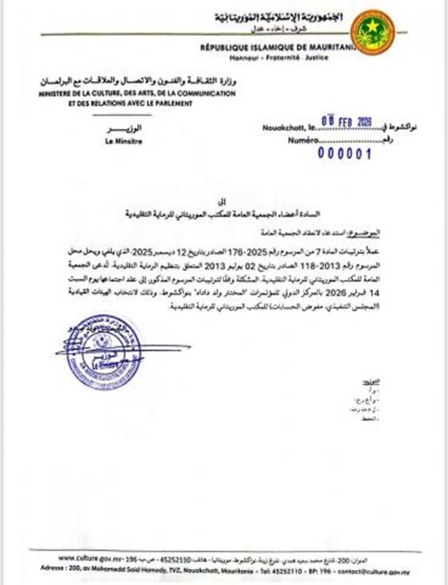 استدعت وزارة الثقافة والاتصال الجمعية العامة للمكتب الموريتاني للرماية التقليدية لعقد مؤتمر بقصر المؤتمرات بنواكشوط.
