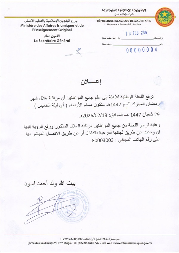 دعت اللجنة الوطنية للأهلة في موريتانيا جميع المواطنين إلى مراقبة هلال شهر رمضان المبارك مساء يوم الأربعاء (ليلة الخميس) الموافق من 18 فبراير الجاري.