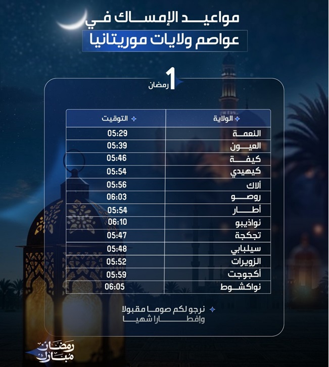 وهذه أوقات الإمساك في عواصم ولايات موريتانيا في اليوم الأول من شهر رمضان المبارك 1447 هـ.