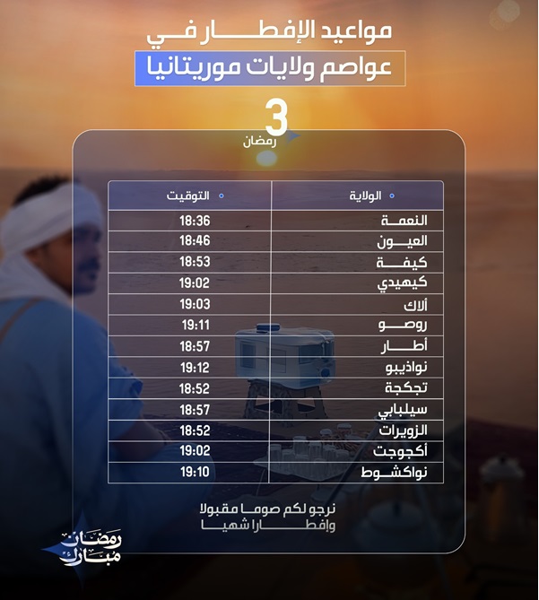 واليكم في مايلي أوقات الإفطار في عواصم ولايات موريتانيا بالنسبة لليوم الثالث من شهر رمضان 1447هجرية.